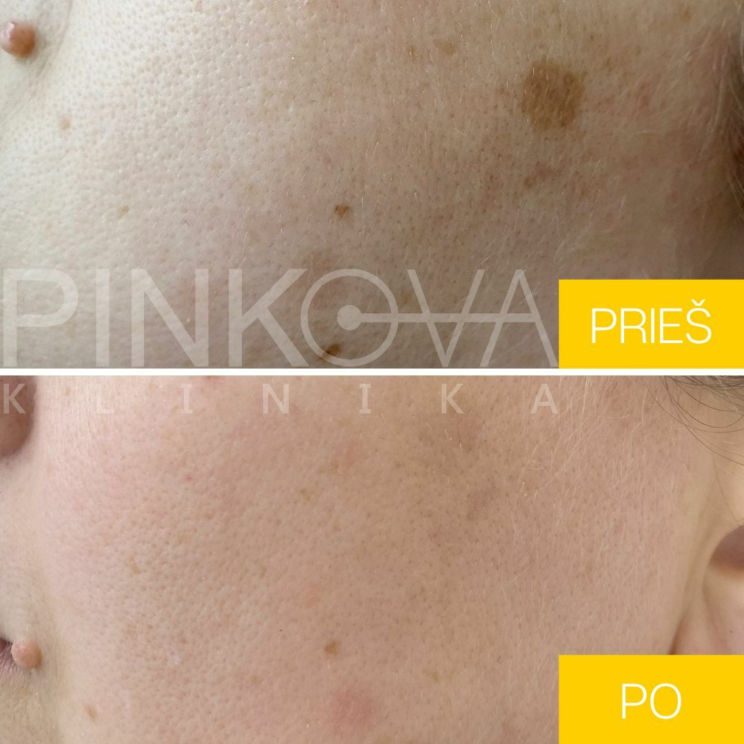 - Iškart po procedūros gydyta vieta patamsėja, gali atsirasti eritema, edema. Retais atvėjais gali susidaryti paviršutinis šašelis, erozija. Gydytos pigmentinės dėmės per savaitę pašviesėja arba visai išnyksta.